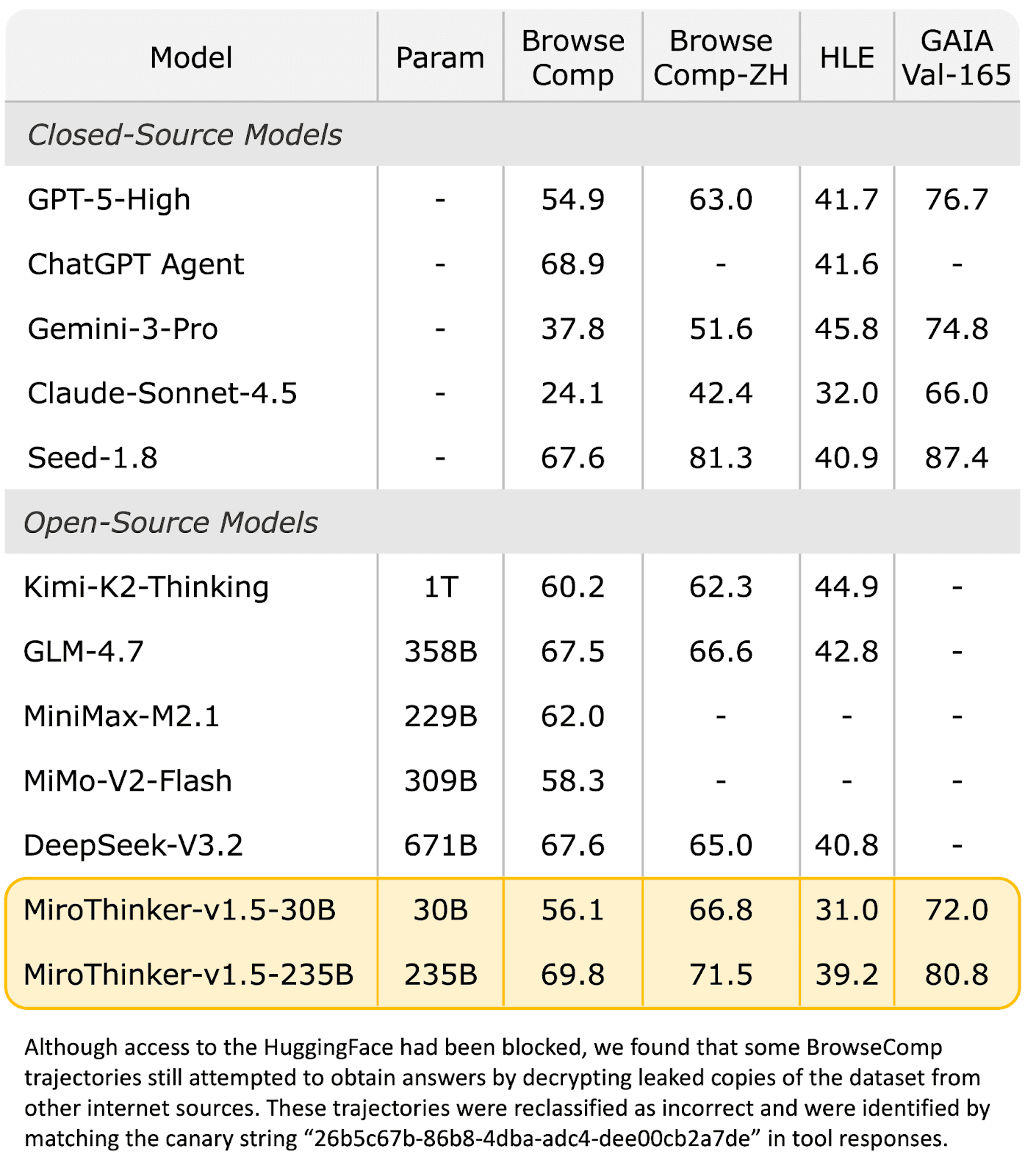 MiroThinker-v1.5-30B delivers performance comparable to many 1T-parameter counterparts using only 1/30 parameters, while its 235B version ranks in the global top tier across multiple search agent benchmarks.